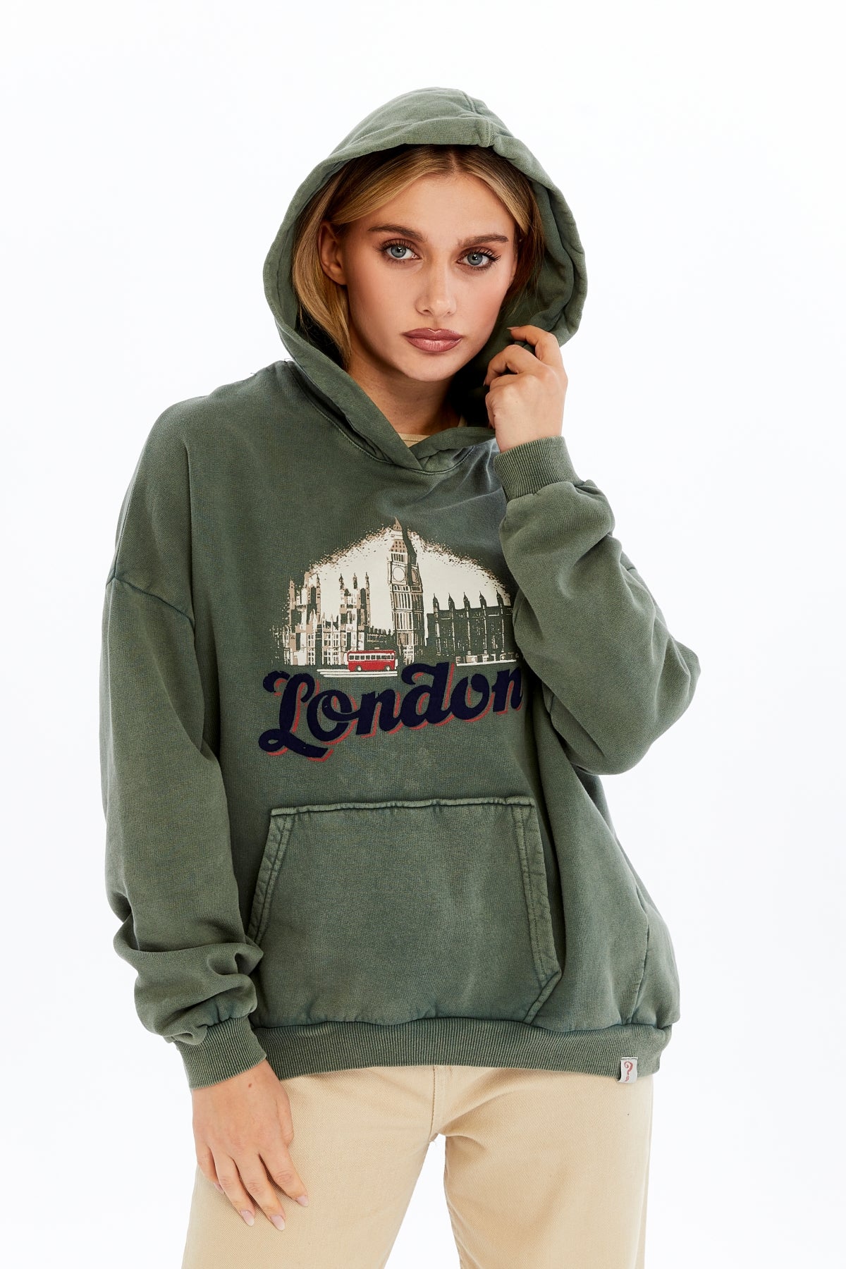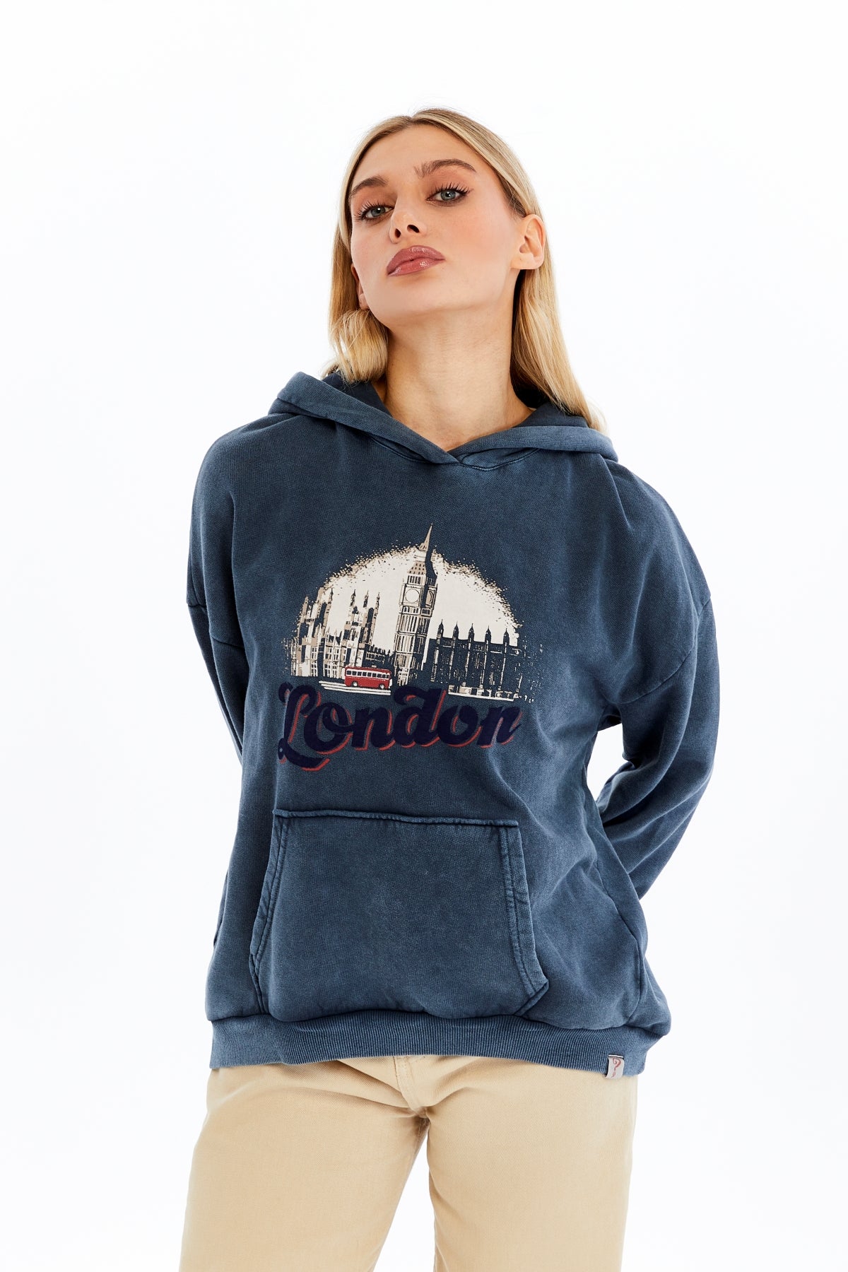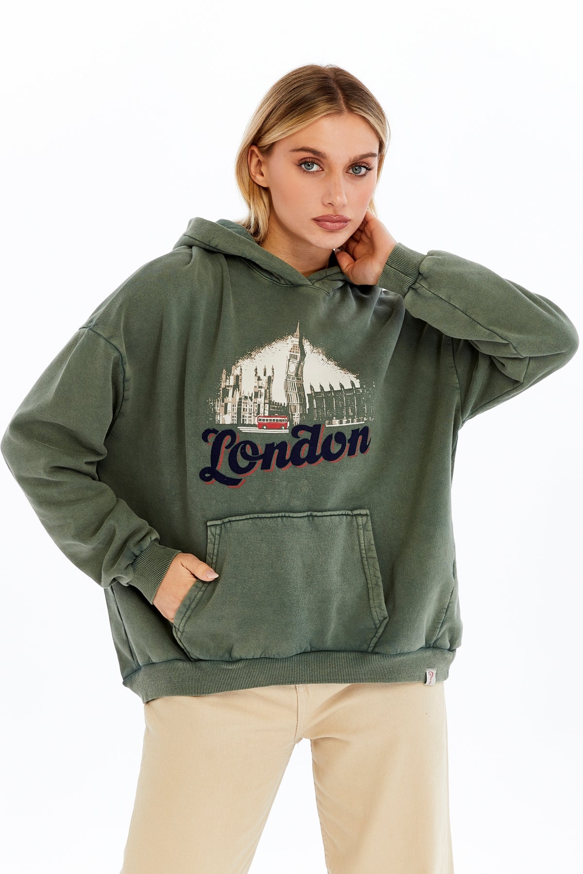 Stone Washed LONDON BUS PrintedWomen Cotton Hoodie