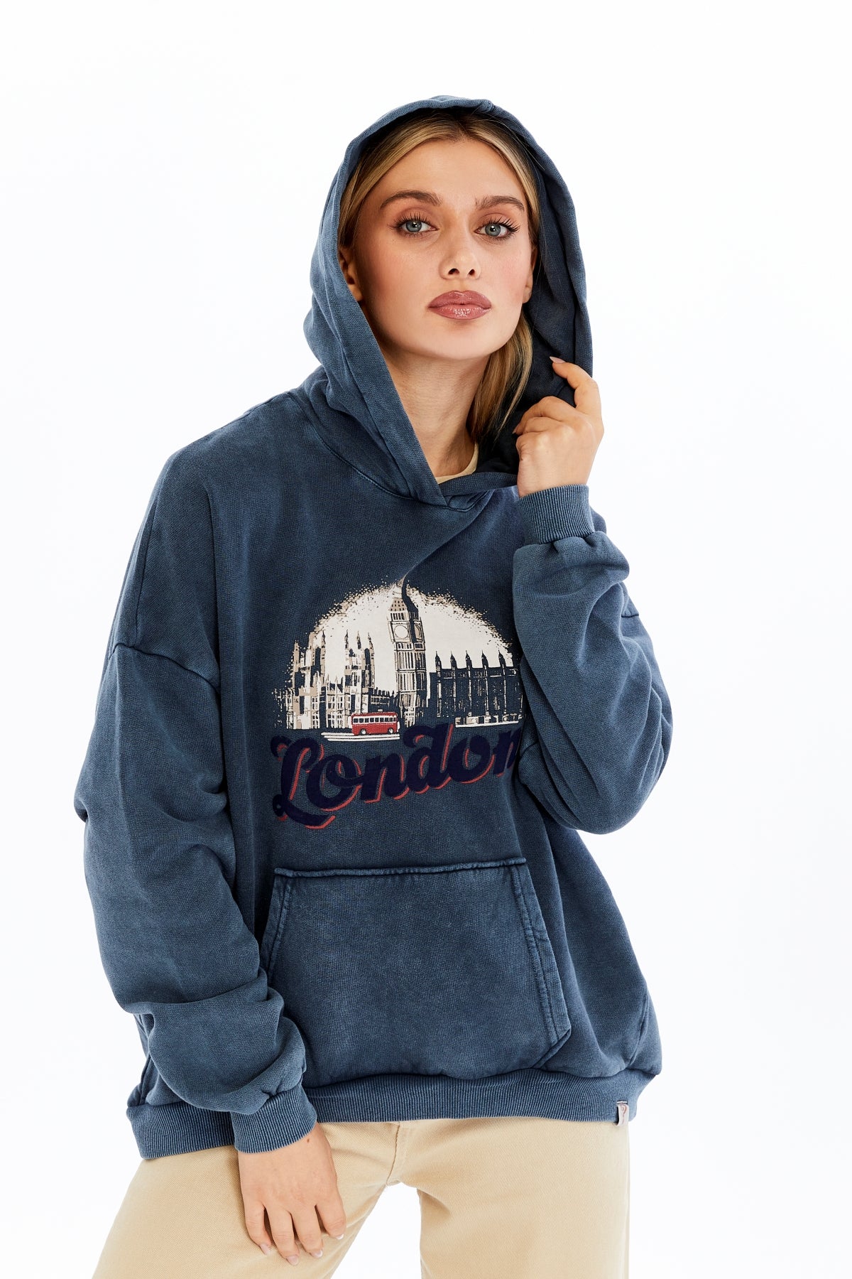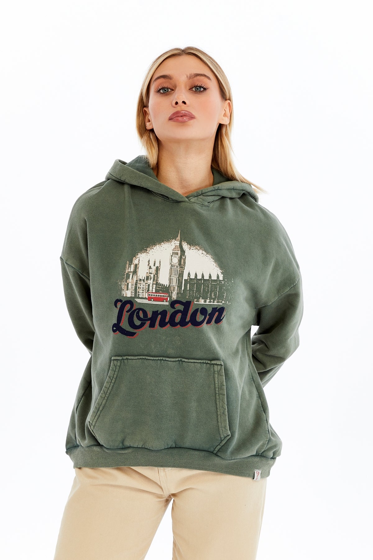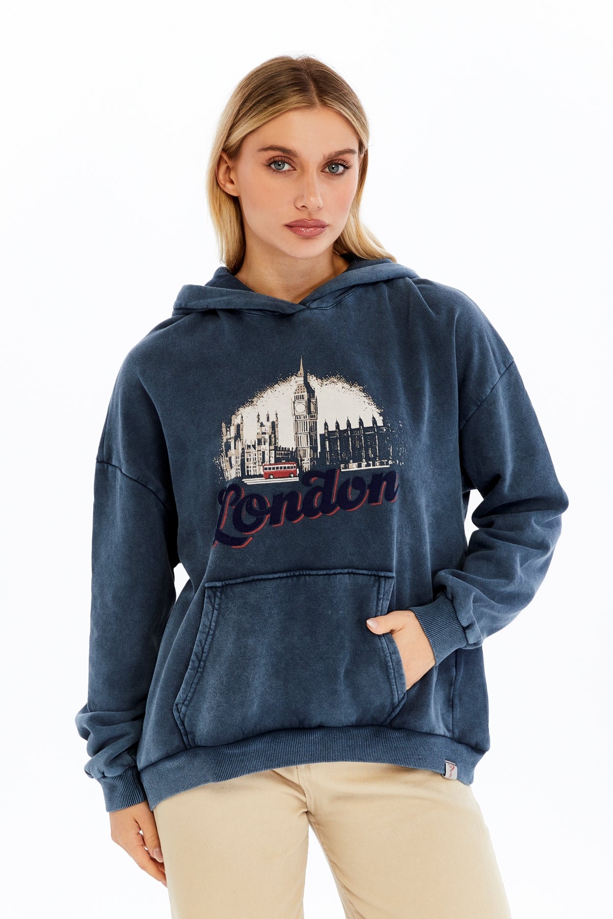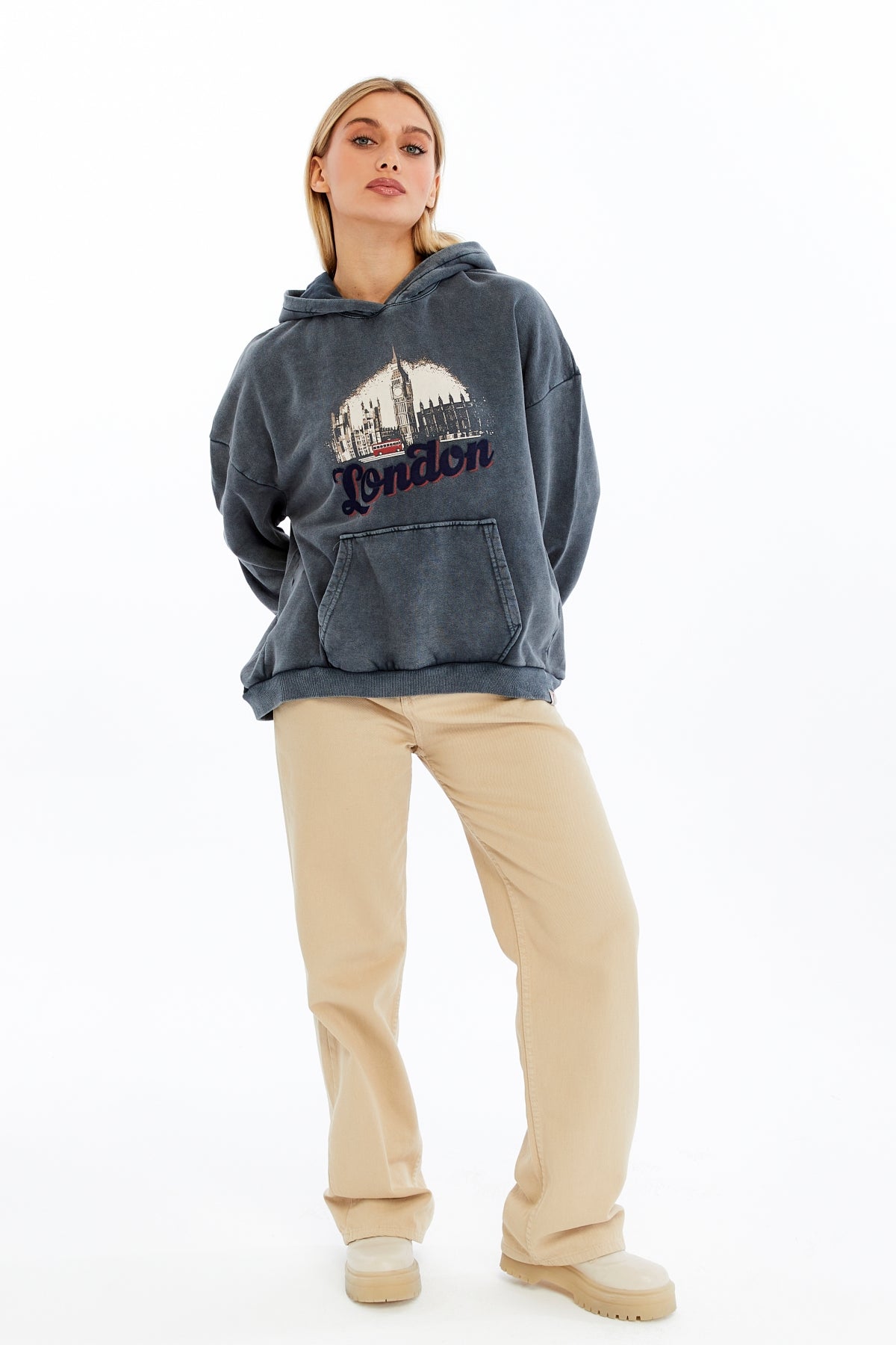 Stone Washed LONDON BUS PrintedWomen Cotton Hoodie