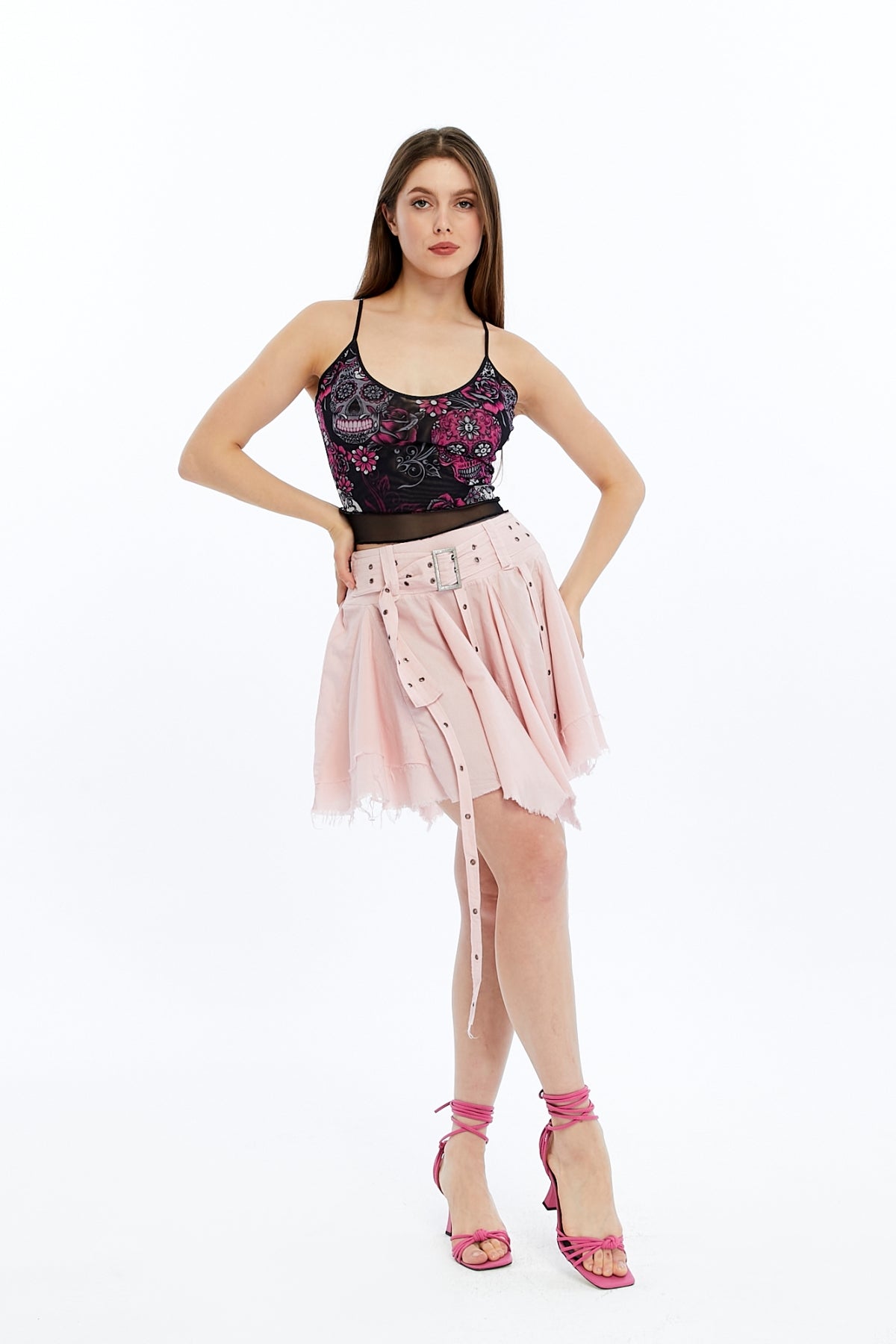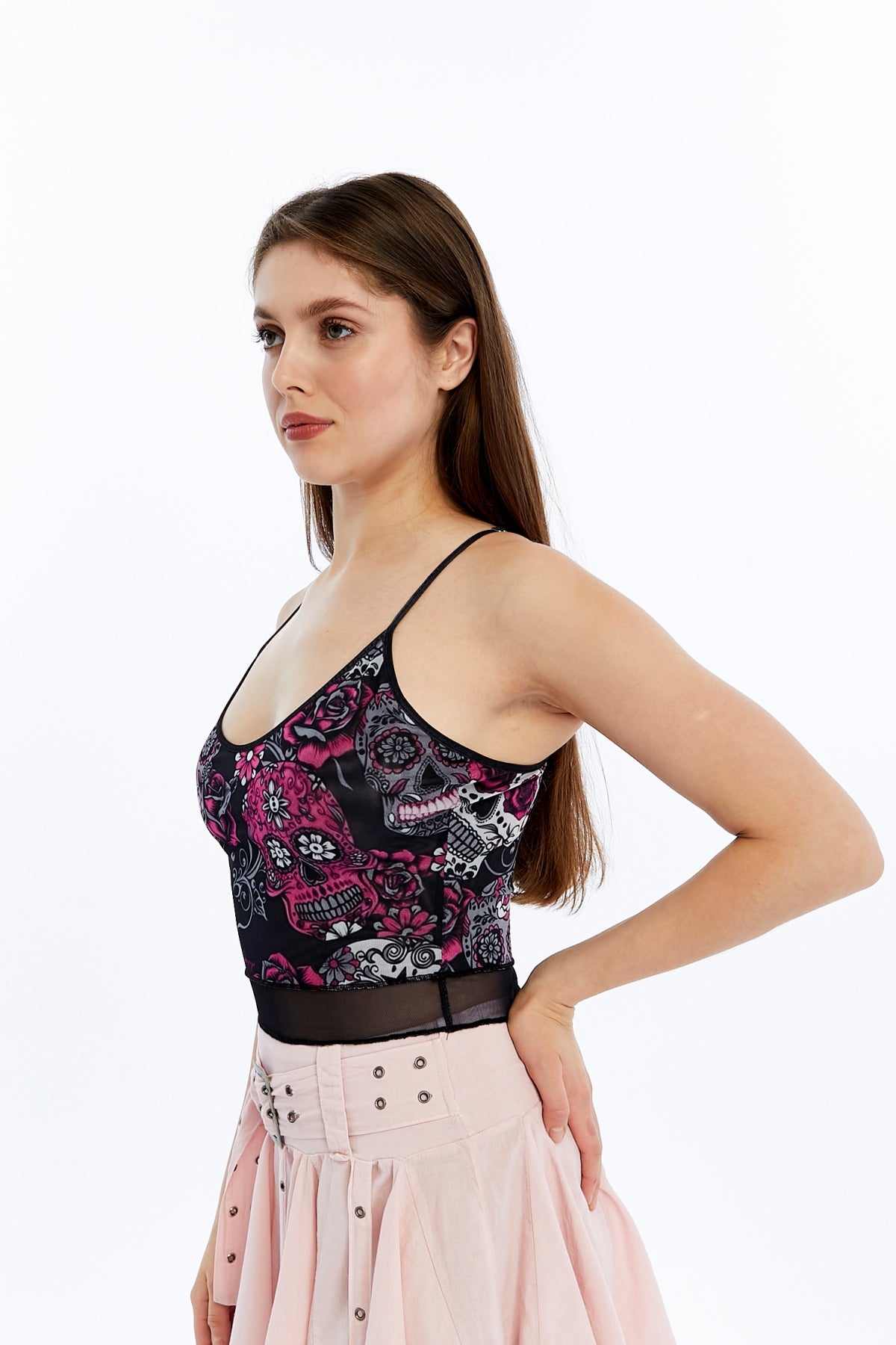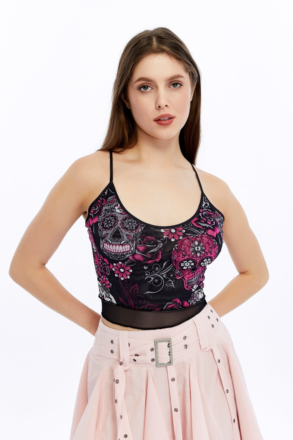 Rose Skull printed Chiffon Crop Top With Strap Shoulder