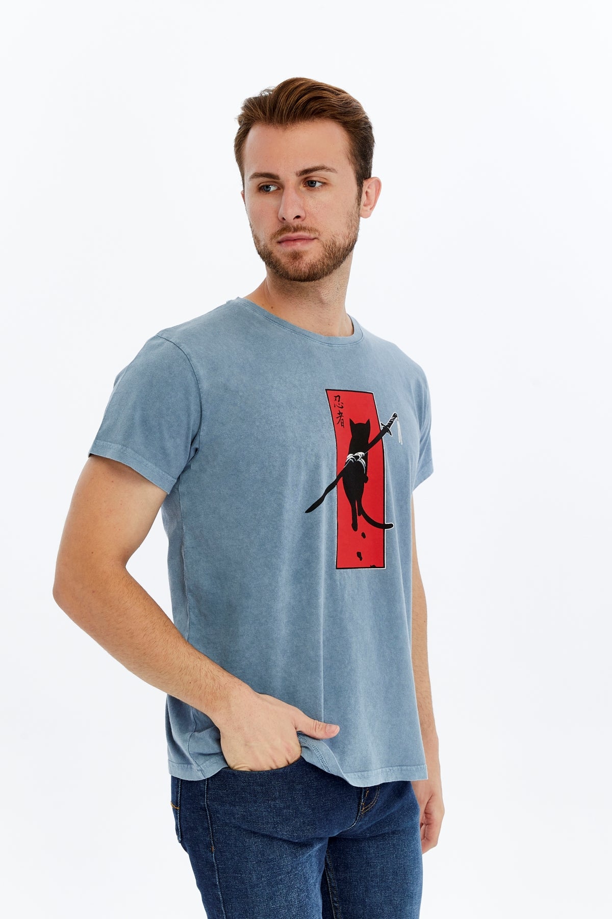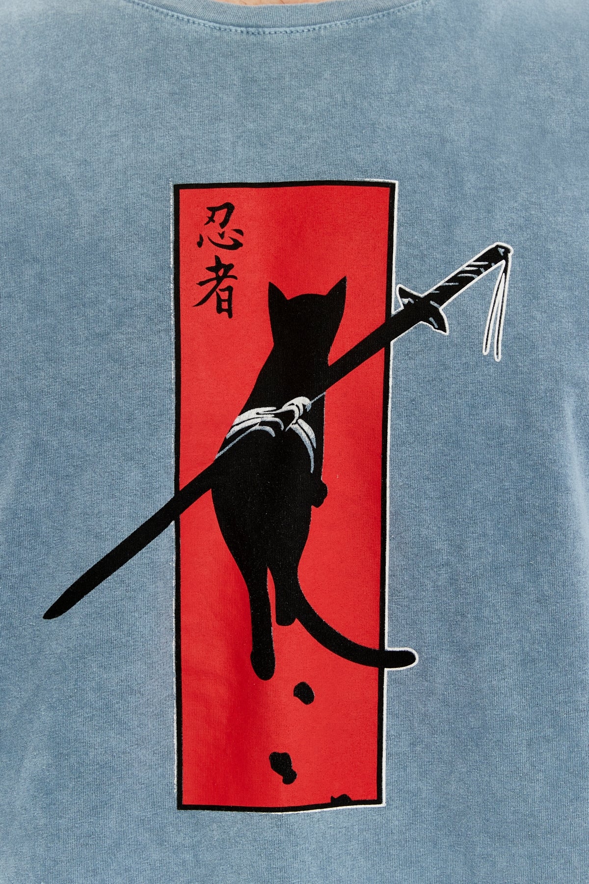 Stone WashedNINJA CAT SAMURAI Printed CottonT-shirt