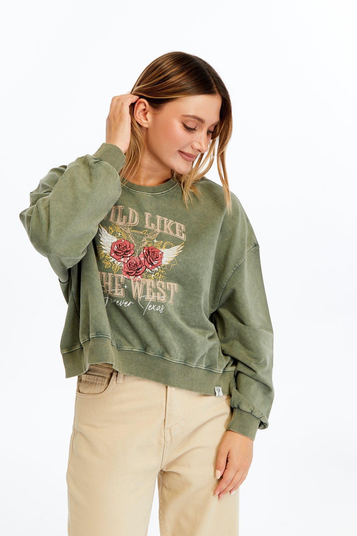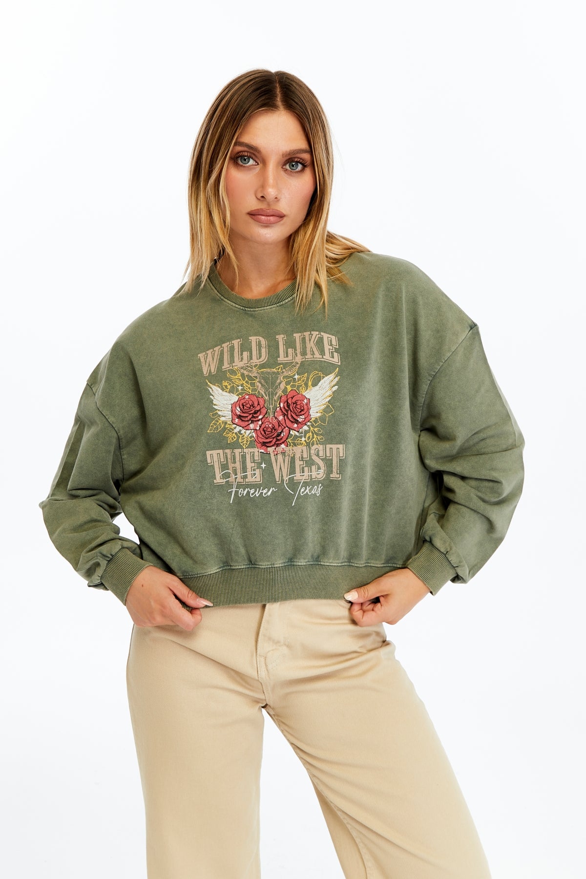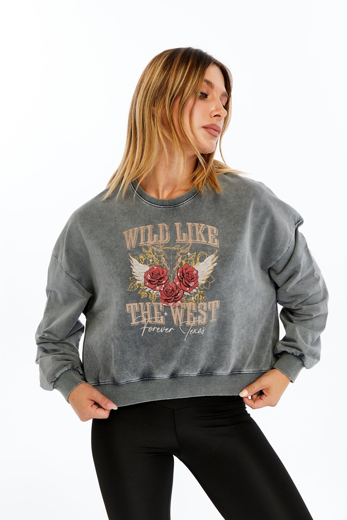Stone Washed WILD LIKE THE WEST FOREVER Printed Women Cropped Sweatshirt
