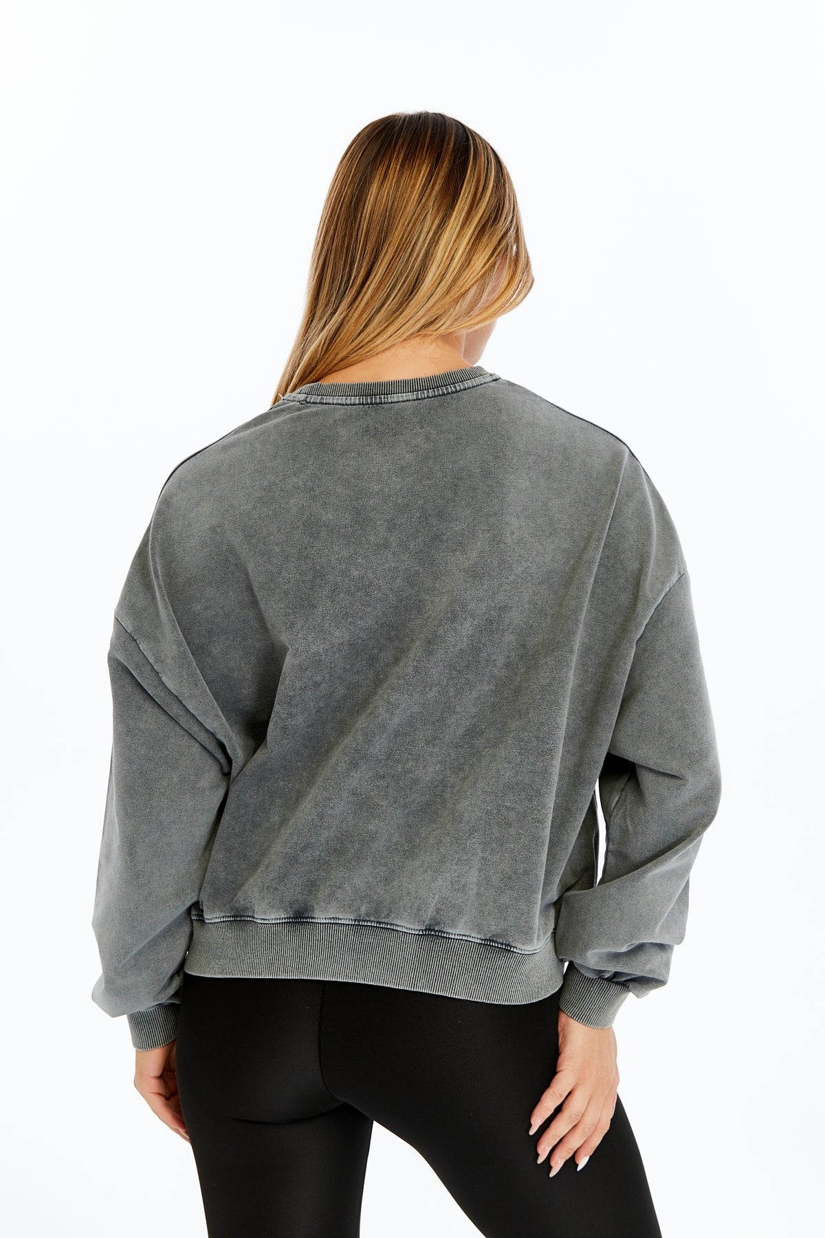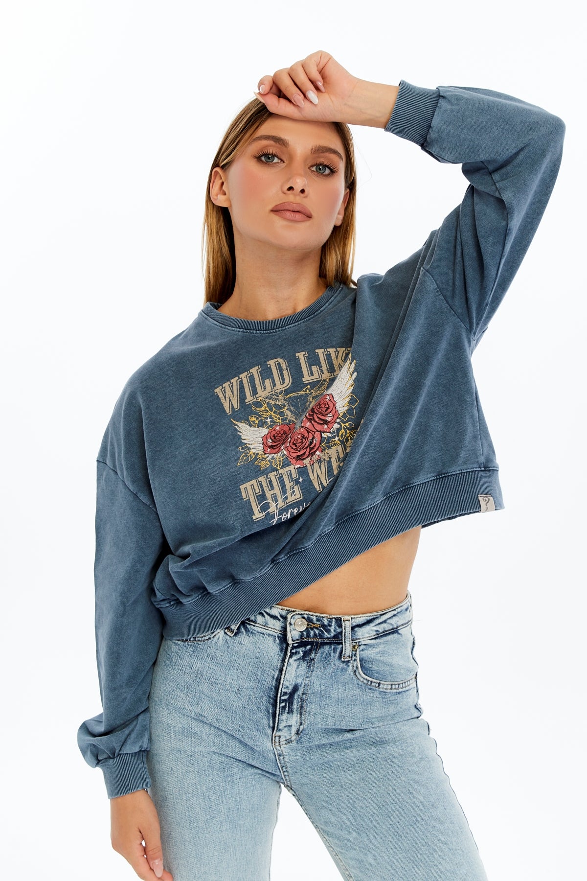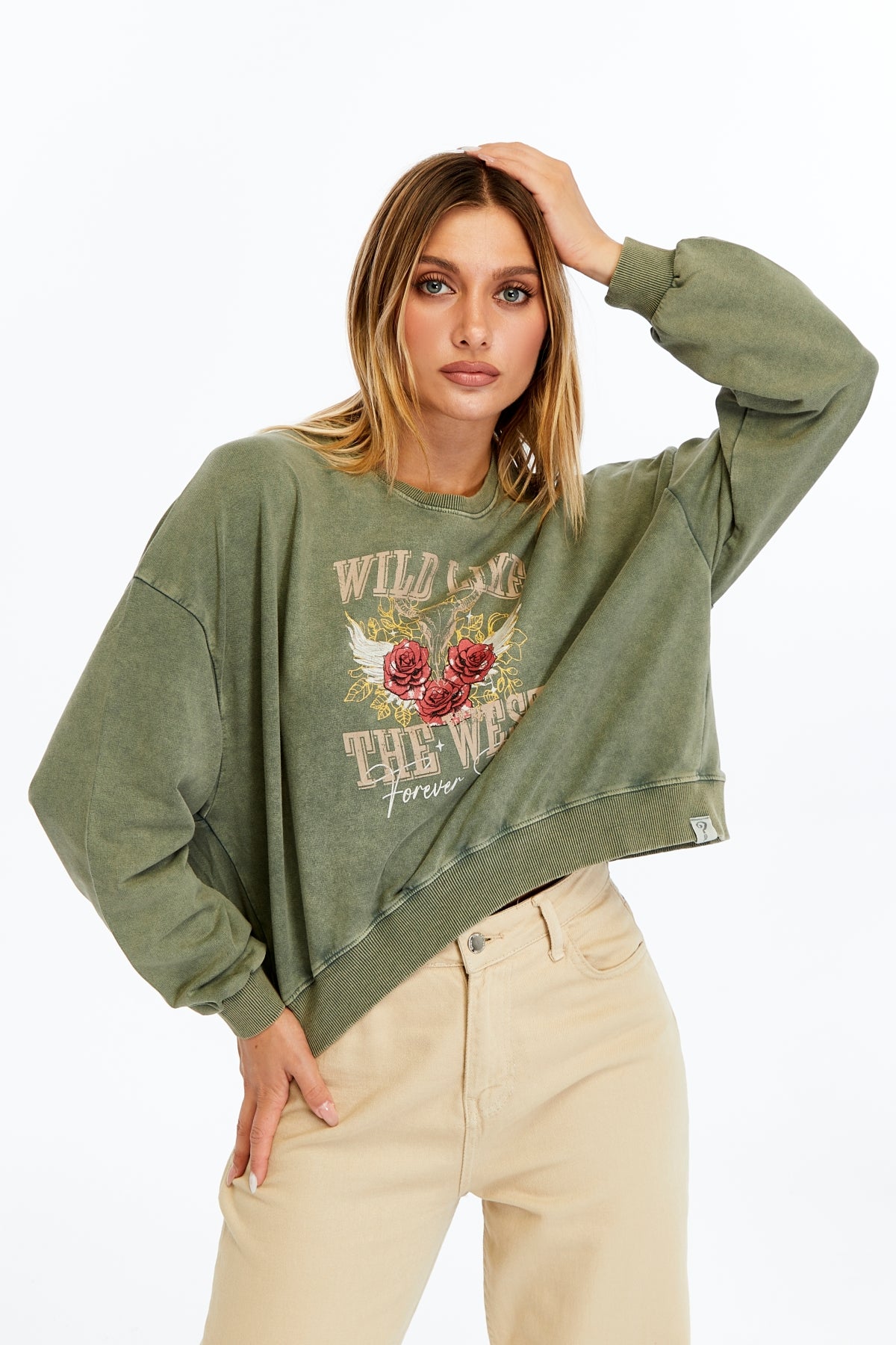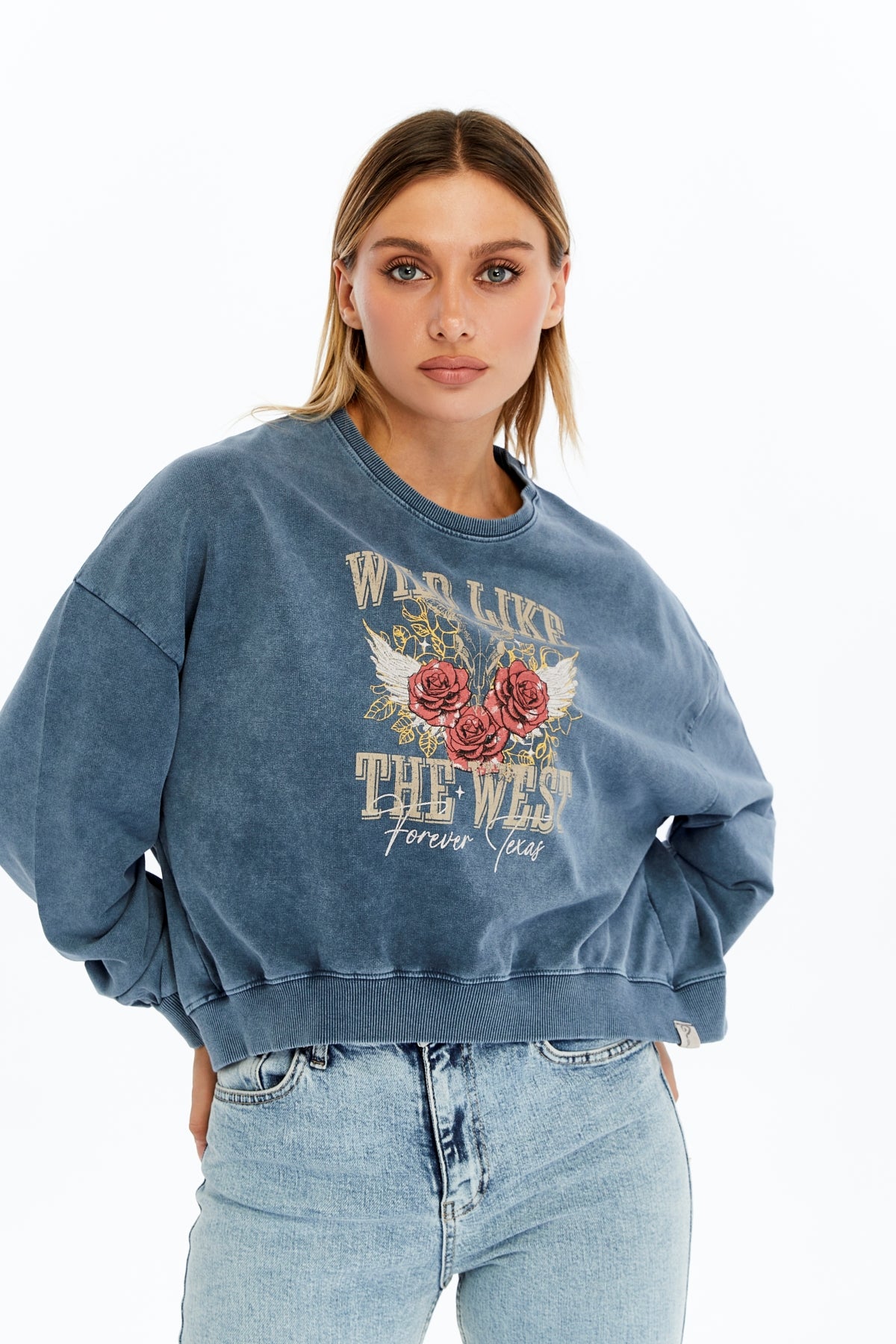Stone Washed WILD LIKE THE WEST FOREVER Printed Women Cropped Sweatshirt