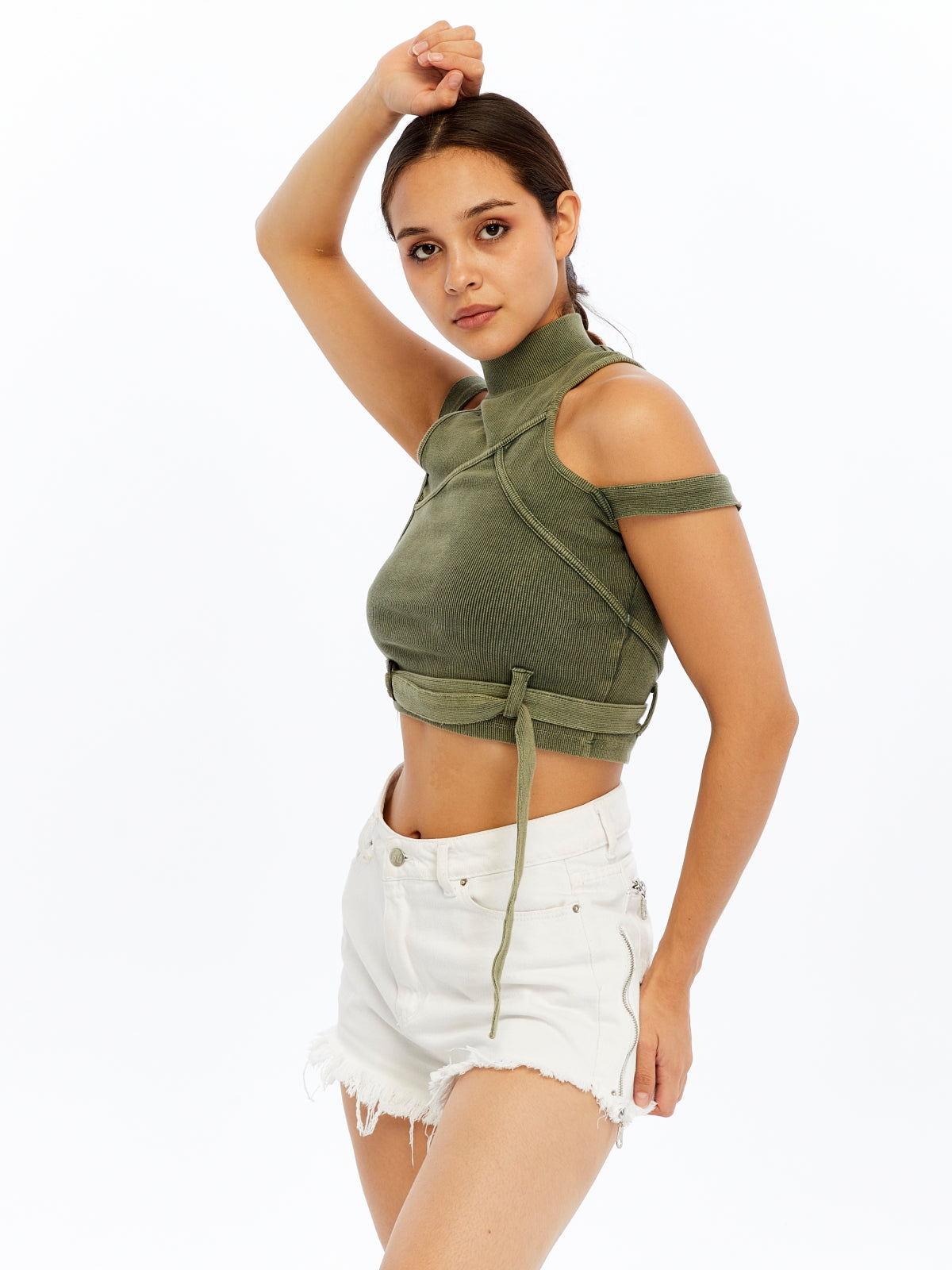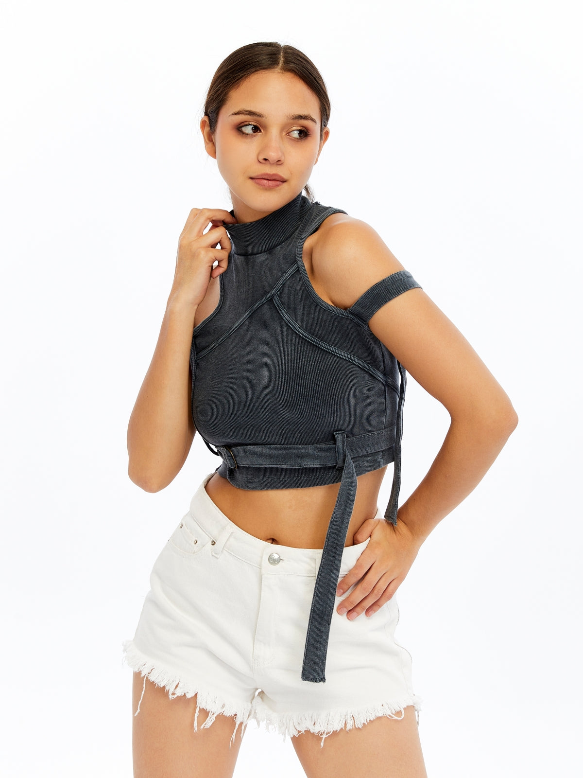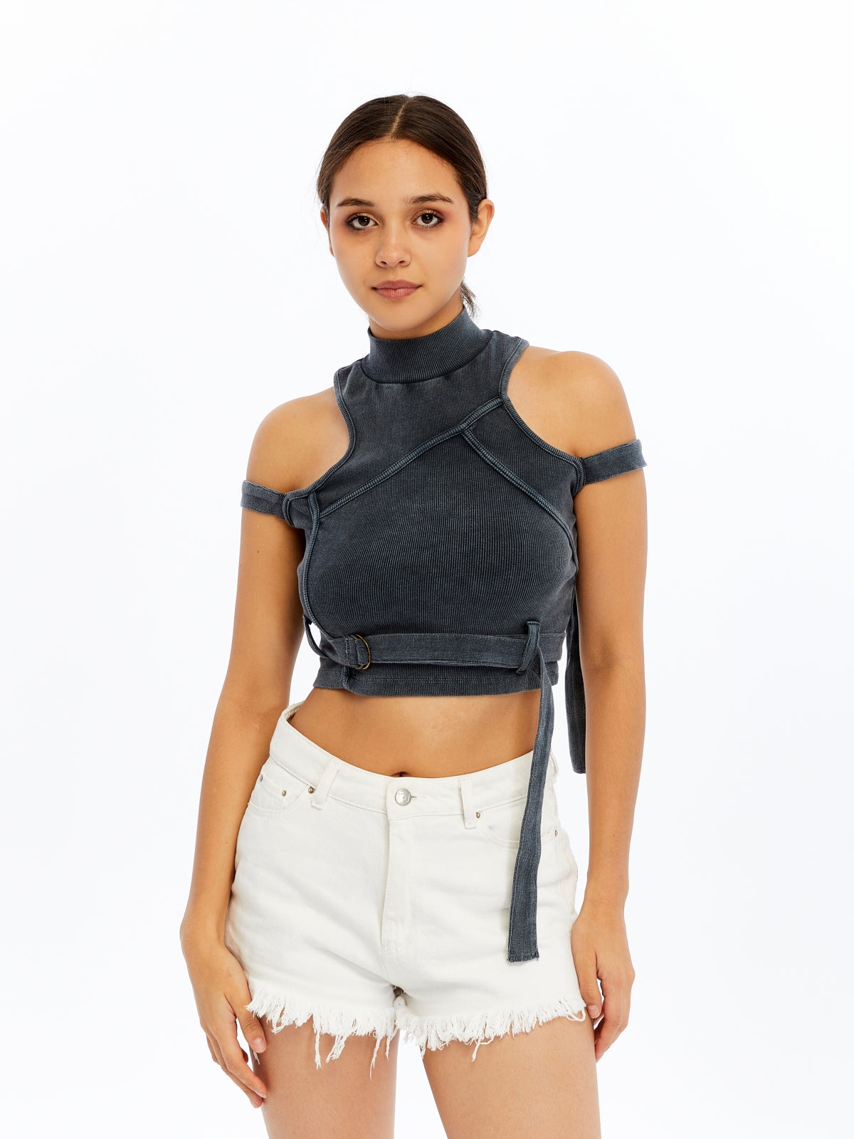 Stone washed HIGH NECK STRAPPY SHOULDER CUT OUTCroppeDTop