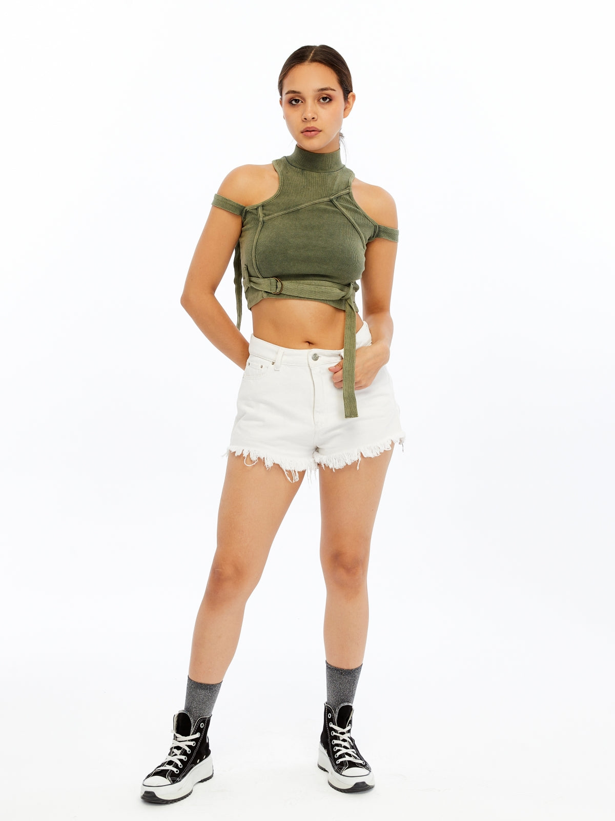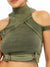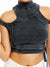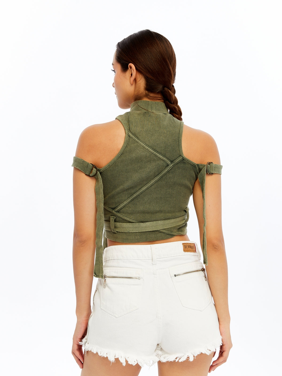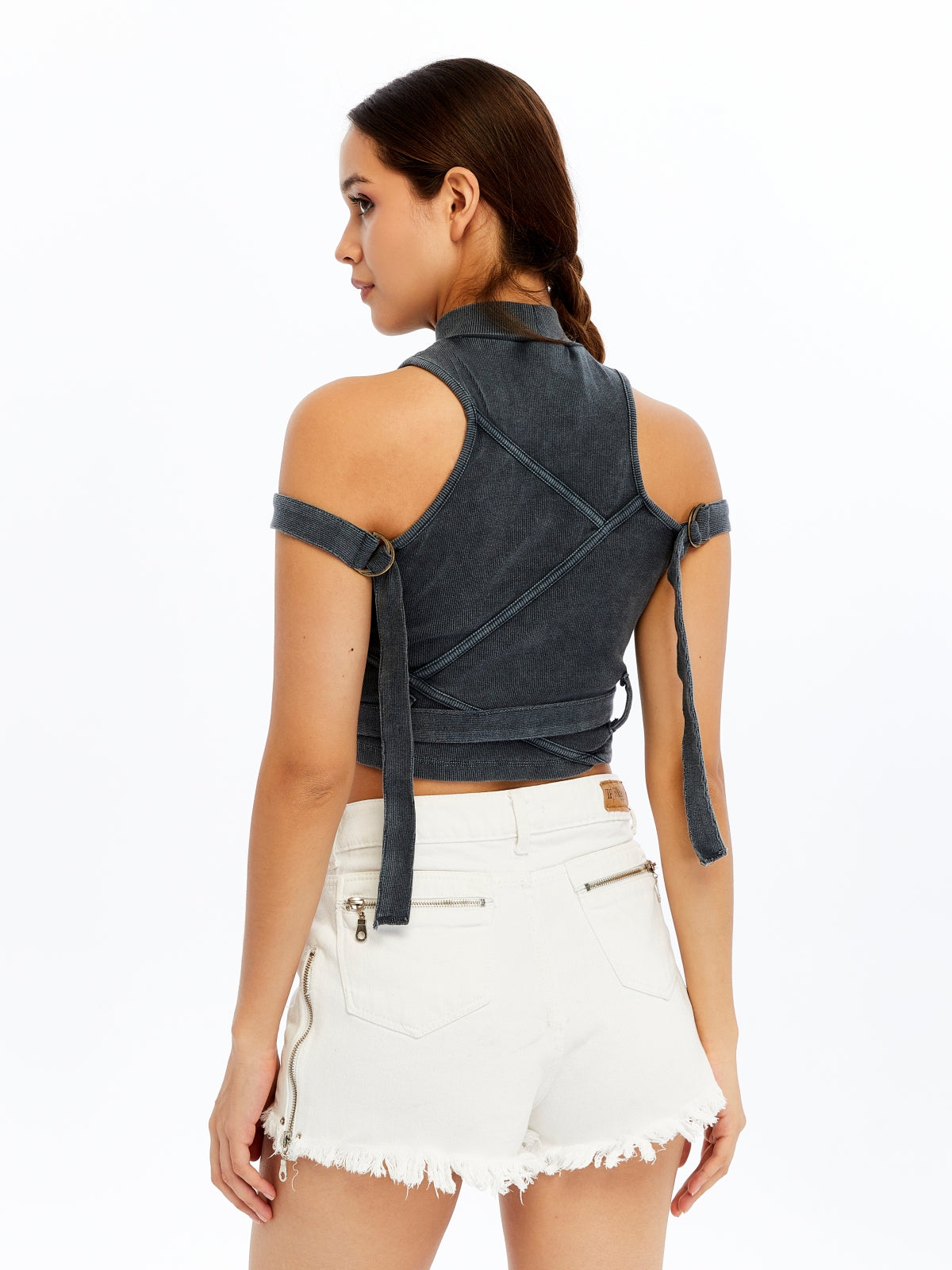 Stone washed HIGH NECK STRAPPY SHOULDER CUT OUTCroppeDTop